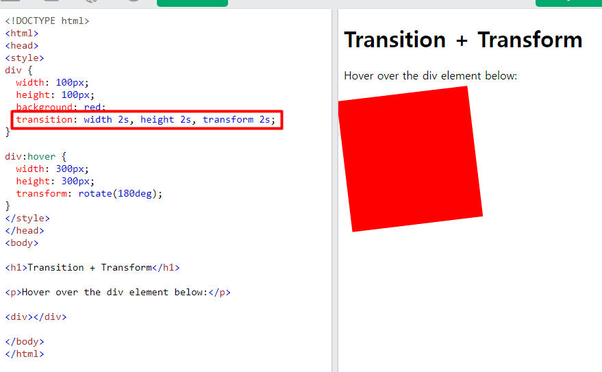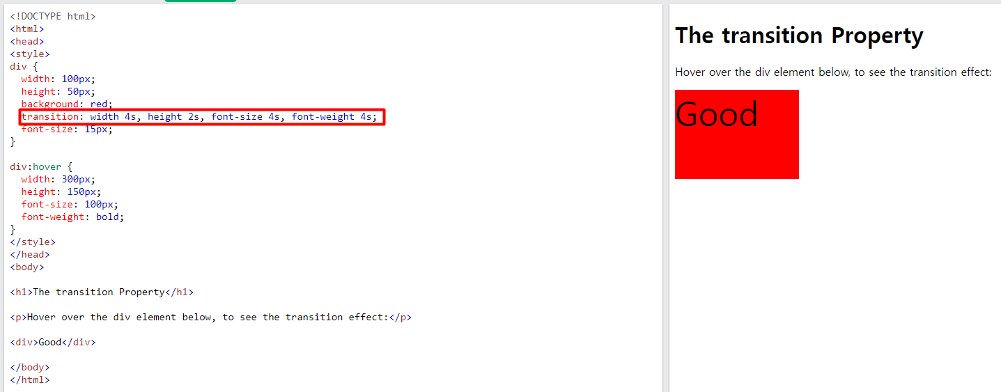 참고: 지속시간의 명확하지 않다면 기본값이 0이 되어 trasition 효과가 발생하지 않습니다.